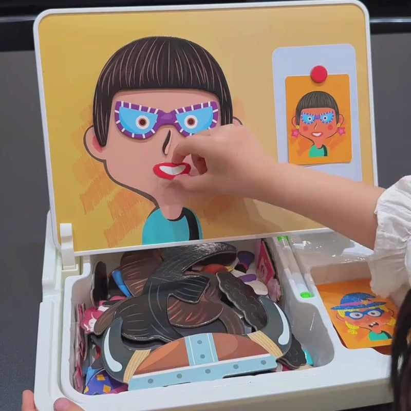 El único juego portátil de rompecabezas que combina construcción de caritas magnéticas, tarjetas guiadas de expresión y una pizarra reutilizable — todo en un kit compacto.